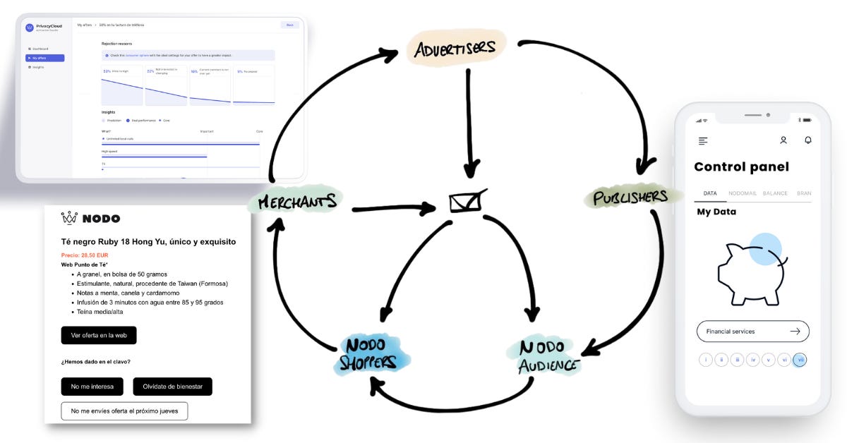 Advertisers drive Publishers. Publishers drive NODO Audiences (able to access premium content through a Single Sign-On that is paid for by their chosen brands). NODO Audiences may become NODO Shoppers (as they start relying on NODO to declare their preferences and receive relevant offers), who in turn wake Merchants up, willing to make their inventory discoverable and, at some point, even turn into Advertisers. The more NODO Shoppers rely on the system to satisfy their needs, the less incentive businesses will have to pour money into individual profiling and intrusive advertising. The more this happens, the bigger the budget available to offer clean, tracker-free publishing experiences, which results in more NODO Shoppers enticing even more Retailers…