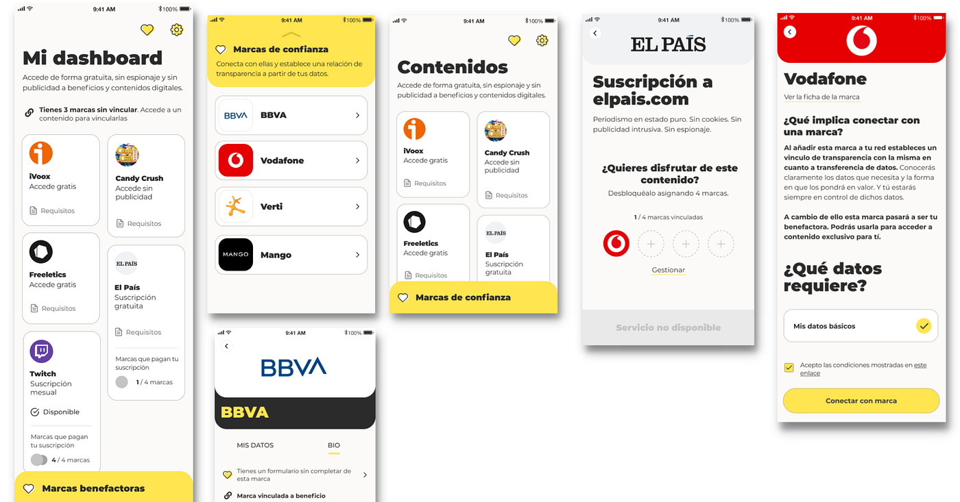 To incentivize these connections, we granted free access to online content or subscriptions, eventually paid for by brands able to leverage the resulting data sets in order to fine-tune their specific offerings or services on the fly, in a privacy-preserving manner. Additionally, we integrated tools for each individual to better understand her “digital self” by learning from the currently available properties/traits in third-party apps installed on the same device, keeping certain items aside for quick access and convenience.
